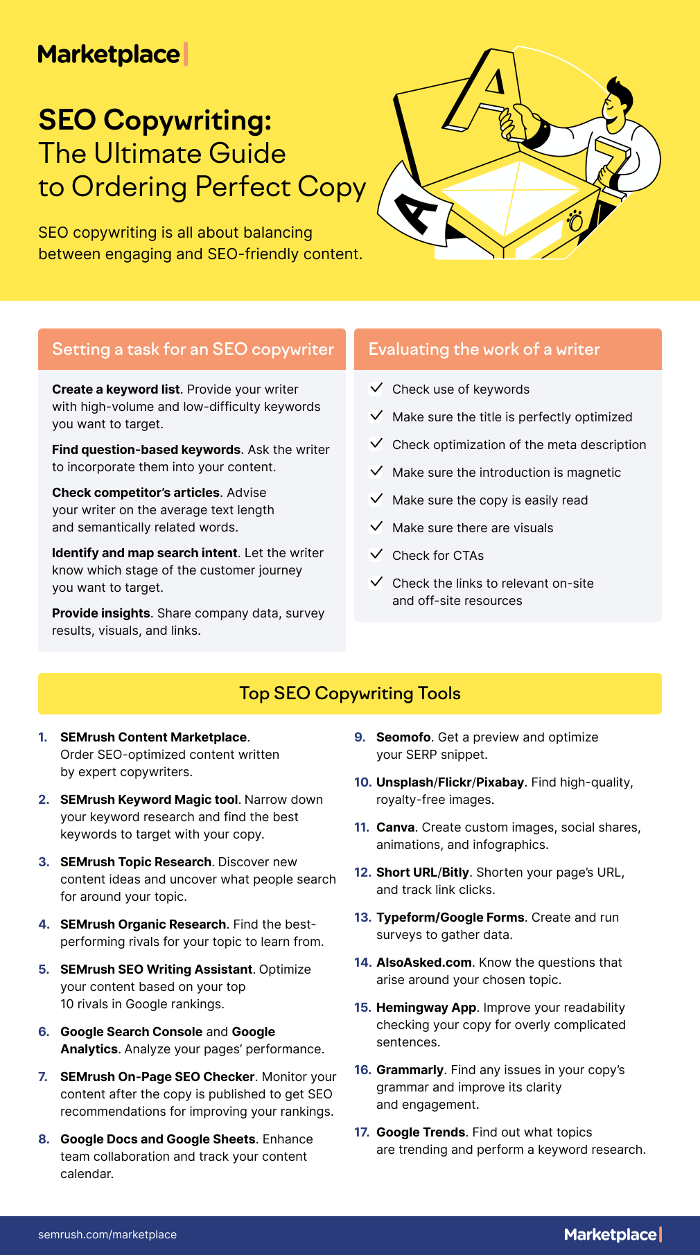 Here’s an example of a Visual Article from this Semrush blog post about ordering great copy, which uses a simple design to organize a collection of copywriting advice by category: