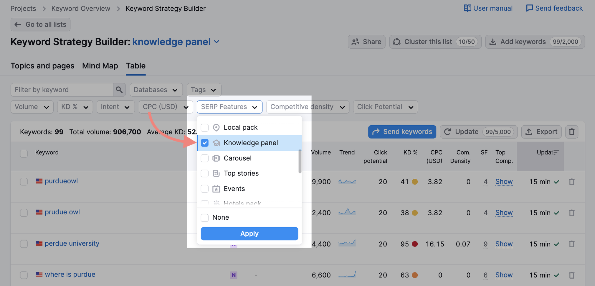 Click on the “SERP features” drop-down, select “Knowledge panel,” and click “Apply.”