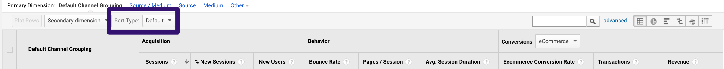Sort Type’s best purpose is finding top growth, or drop-offs, in metrics on specific pages, devices, campaigns, sources or other dimensions.