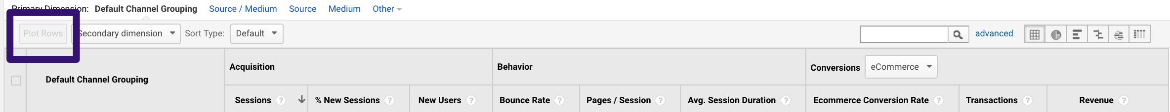 - Plotting rows keeps the total sessions on the chart instead of creating a new chart with only the data selected. Sometimes selecting a specific dimension value offers much better visuals than the Plot Rows feature