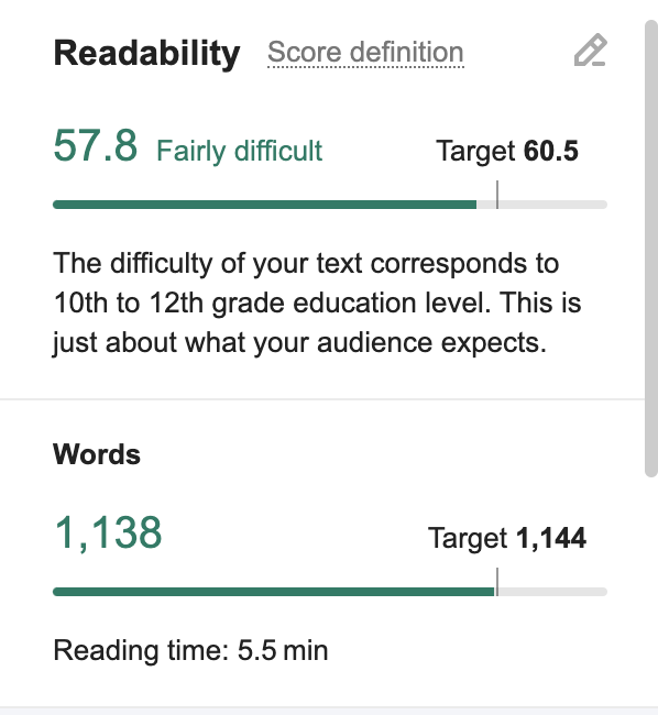 • Click on the ‘Readability’ button. Check the target readability for your article and compare the figure to your current readability. The higher the score, the easier the language should be. Click on the ‘Score definition’ to learn how the score works.
