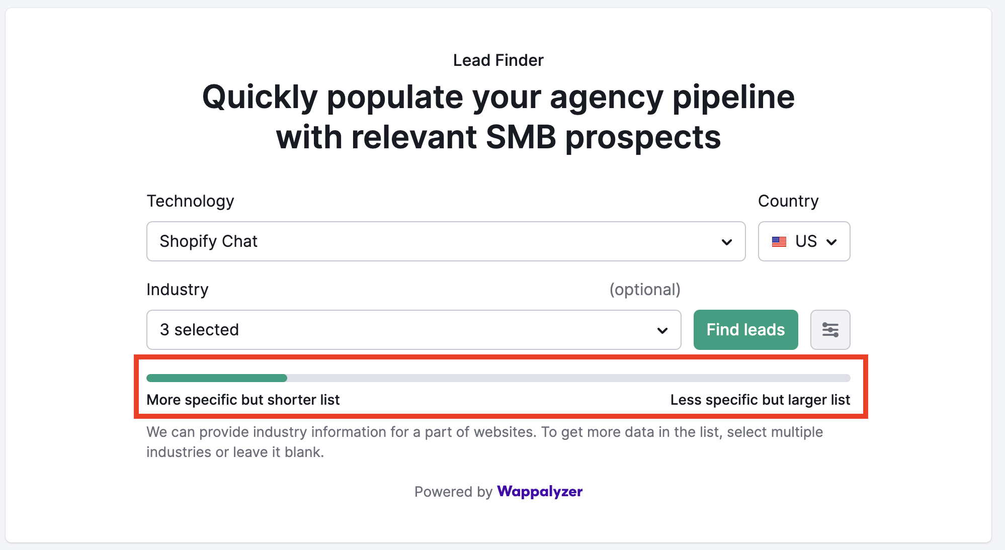 Lead Finder helps digital agencies and marketers quickly find relevant business leads based on their location and the web technologies those leads use.
